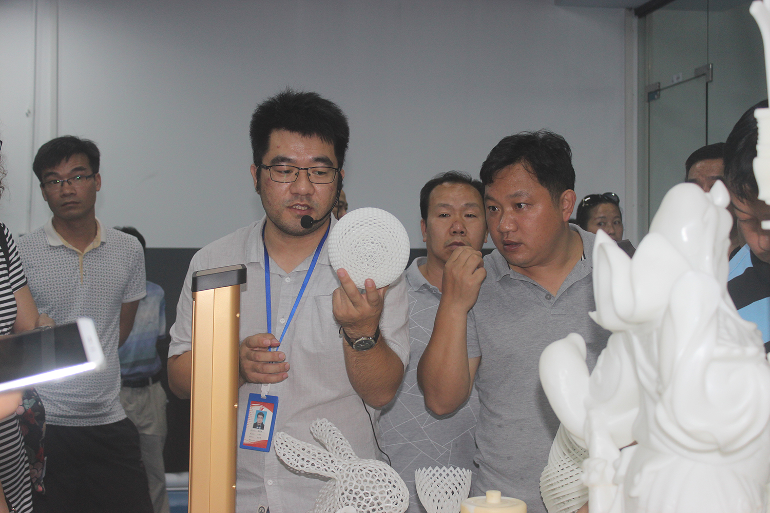 隨后,參訪領導一行參觀了生產車間,對浙創科技的技術力量、機械設備、產品研發進行了了解。在浙創科技的樣品間,陶總親自向參訪領導介紹了公司與浙大聯合研發的光敏樹脂,以及光敏樹脂打印出的產品,并通過幾個典型的3D打印模型,具象的介紹了3D打印的優點。