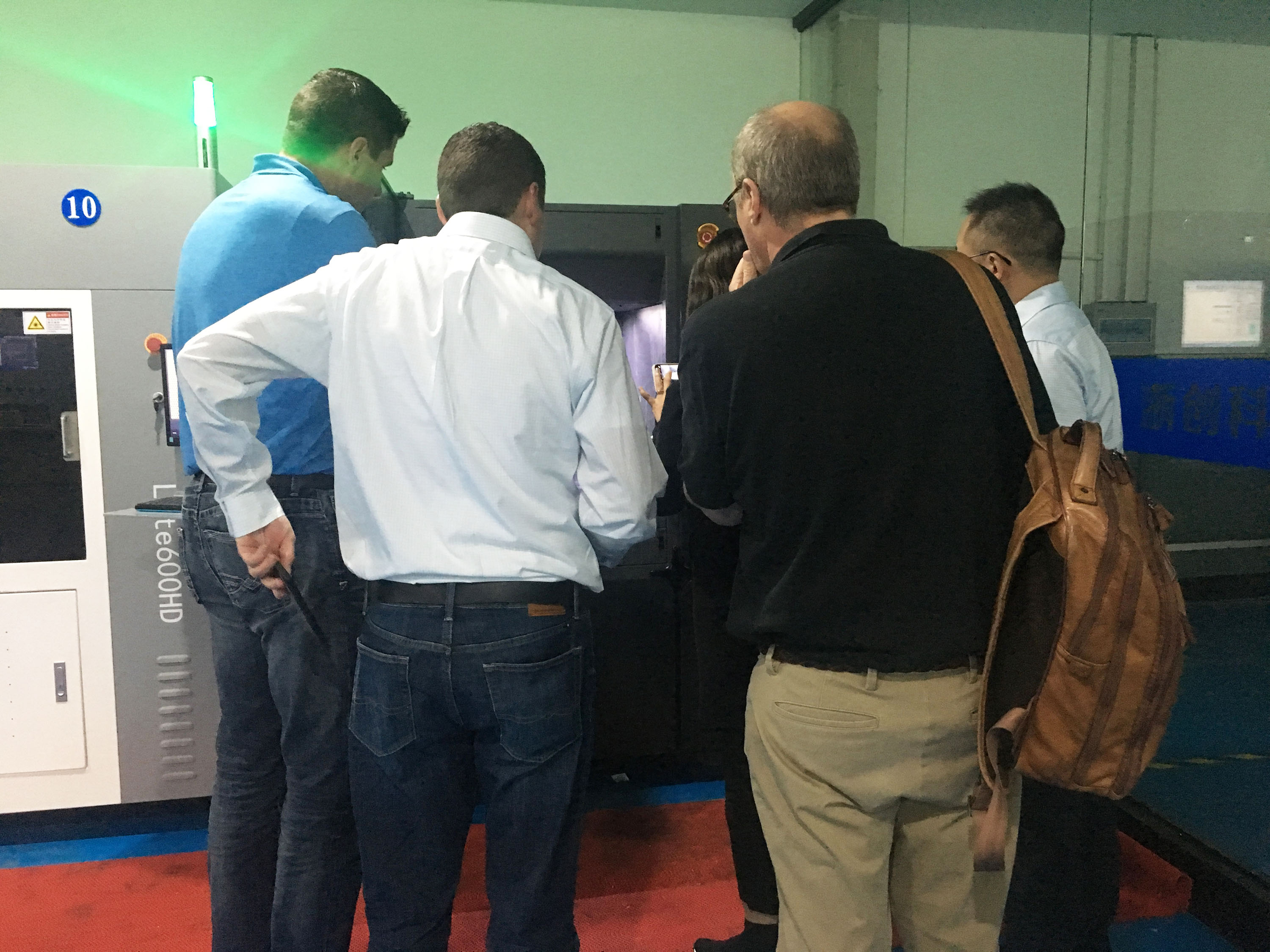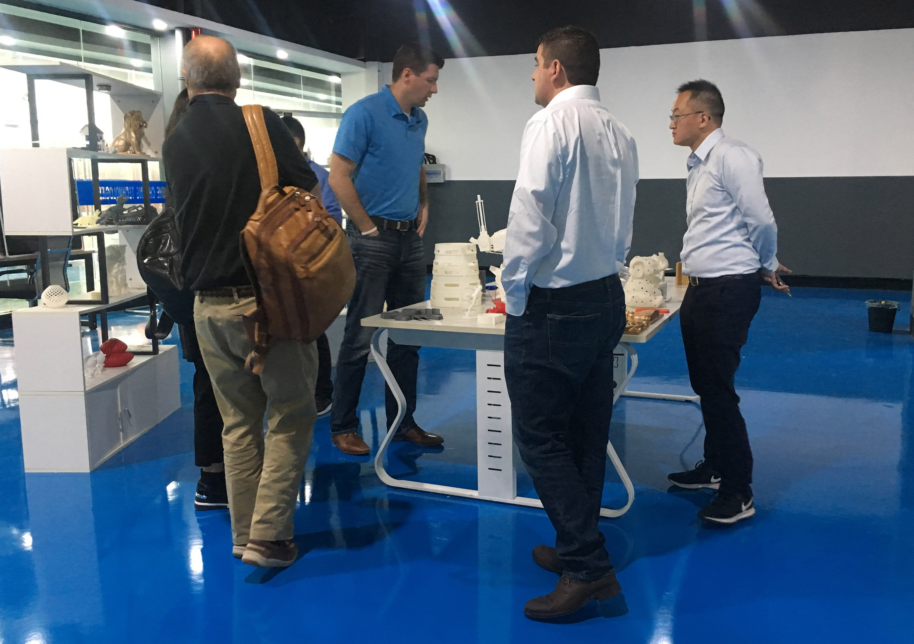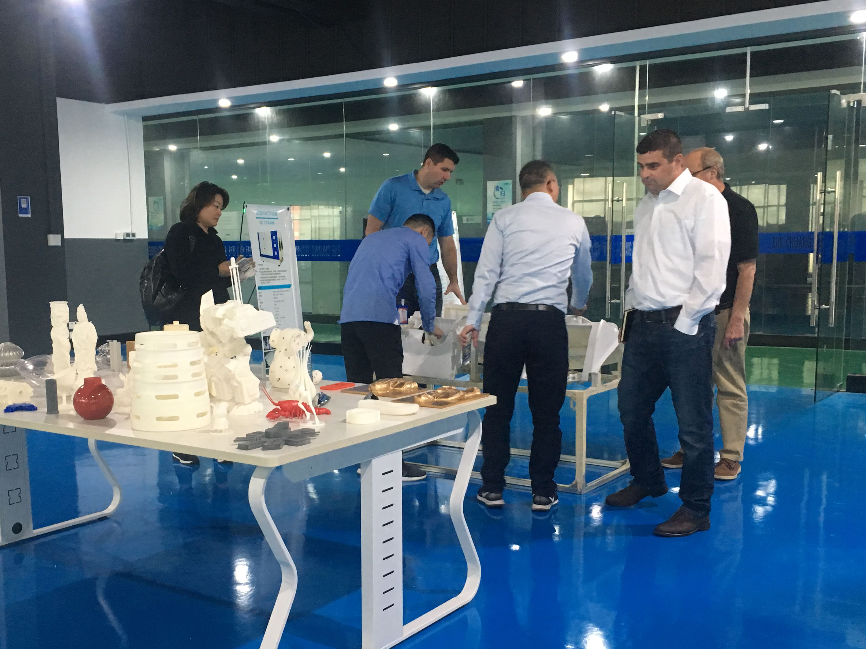 在陶董事長的帶領下,美國客戶一行先行參觀浙創(chuàng)科技3D打印車間。陶董事長詳細介紹了3D打印機的工作原理,并向美國客戶展示了打印完成的整套茶具模型。呈現(xiàn)在客戶面前的并不是最終的手板模型,還會通過專業(yè)的后處理進行加工,力求優(yōu)質。針對美國客戶手板打印的需求,陶董事長提出通過“3D掃描+工業(yè)設計+3D打印”的一站式解決方案,為客戶打印樣品用于驗證,從而減少客戶的研發(fā)成本。